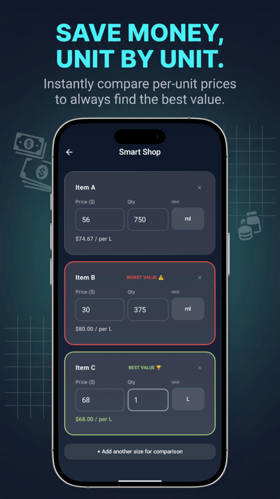 - Calculate price per unit (kg, L, etc.)