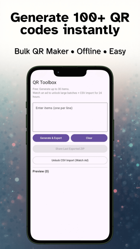 If you need QR codes for inventory, events, schools, restaurants, print shops, or product labeling, QR Toolbox makes the entire process effortless.