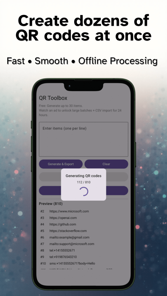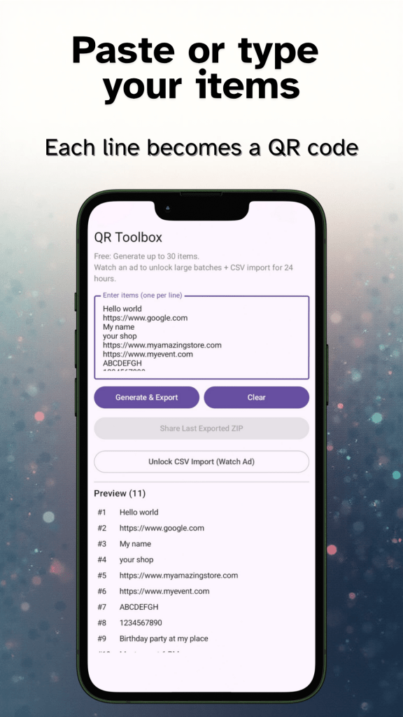 Just paste text, one item per line — the app instantly turns each line into a QR code.