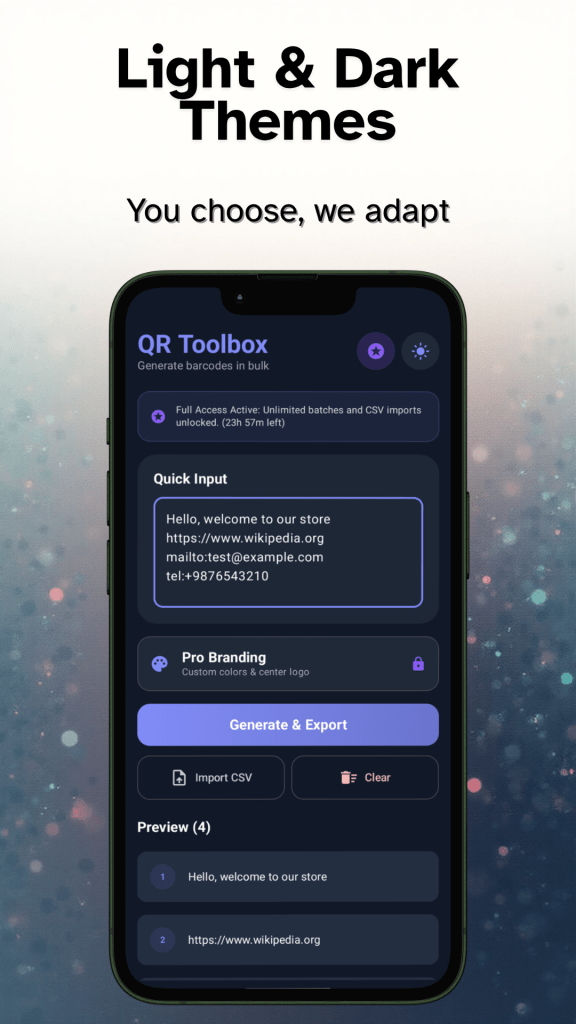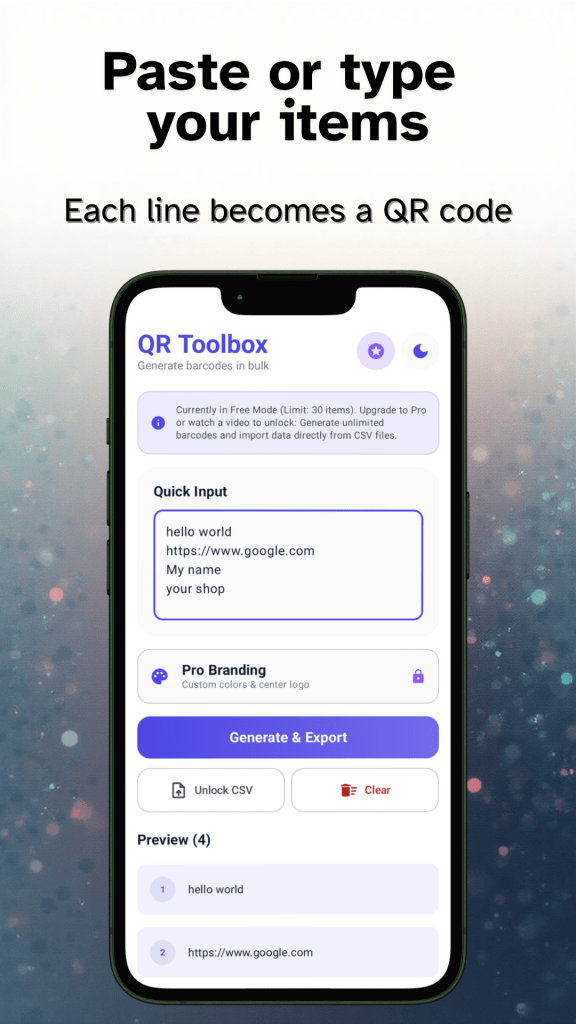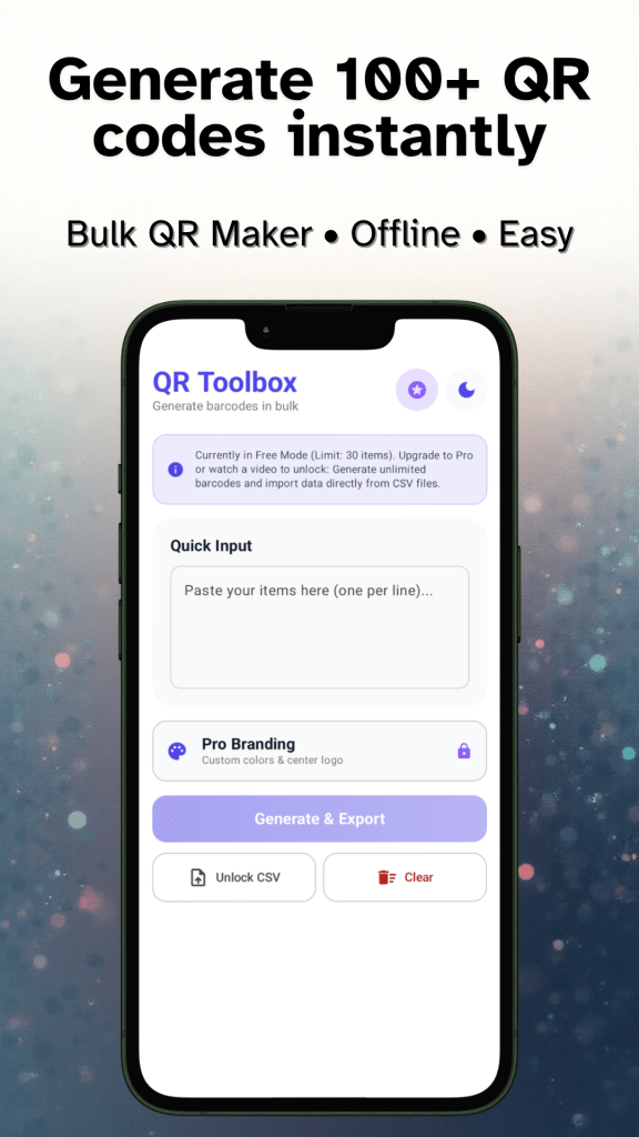 If you’re working with QR codes at scale — inventory, events, schools, restaurants, or product labeling — QR Toolbox removes the friction completely.